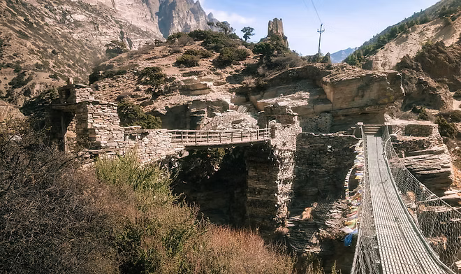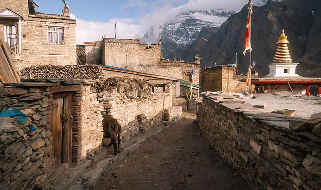 Climb steeply up to Nar Village, the largest and most vibrant settlement in the region. Today’s views are especially dramatic: the Nar Khola gorge, the immense Kanguru peak, and large Tibetan stupas create a deeply spiritual setting.