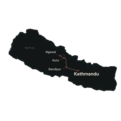 A long but scenic drive takes you deep into the Himalayas, passing terraced fields, waterfalls, and remote mountain roads. After lunch at Besisahar, continue to Koto along the original Annapurna Circuit route. This rustic mountain town marks the edge of the Nar and Phu region.
